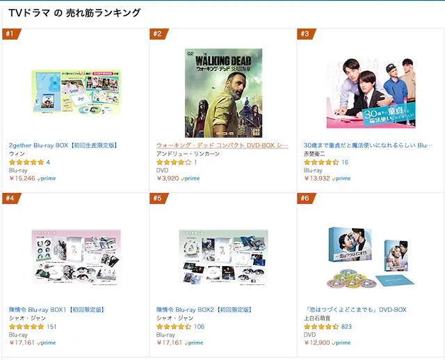 2月20日現在、AmazonのTVドラマの売れ筋ランキングでは1位! 全体ではDVD全体では44位と、日本での2getherの注目度の高さが現れてます。